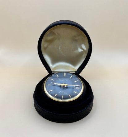 Elegante opklapbare reiswekker van Gübelin met diepblauwe wijzerplaat, goudkleurige indexen en datumvenster op 3 uur. De klok is uitgerust met een hoogwaardig Zwitsers 8-daags mechanisch uurwerk met 15 jewels, waardoor hij na één keer opwinden dagenlang betrouwbaar doorloopt.