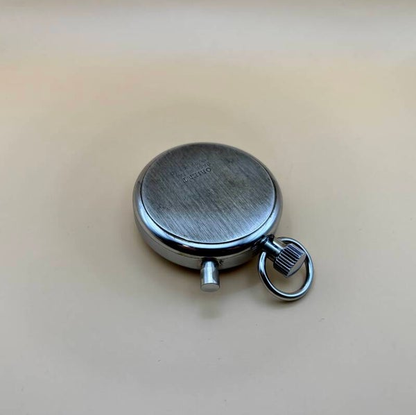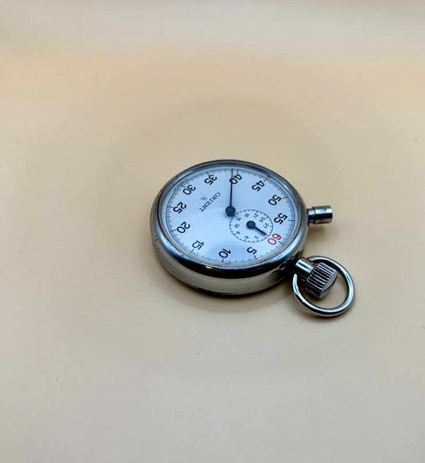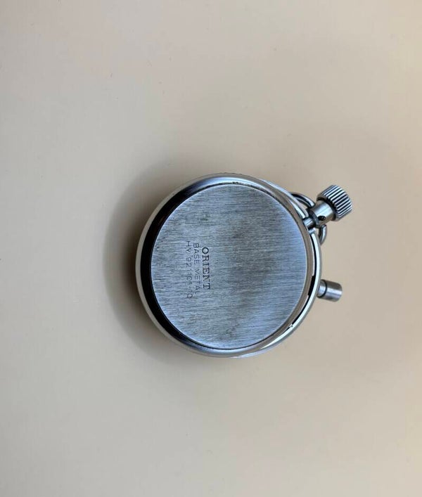 Klassieke Japanse stopwatch van ORIENT met het handopwind-uurwerk BF 411. De centrale secondewijzer telt in stappen van 1/5 s (0,2 s) en het bovenste subregister registreert tot 30 minuten. Een functionele, goed werkende stopwatch met een strak, tijdloos ontwerp: witte wijzerplaat, duidelijke 5-staps schaal en rode “60” op twaalf uur. Doorsnede zonder kroon 48 mm met een gewicht van 95 gram. Heeft een flyback functie waarmee de stopwatch naar 0 wordt gereset zonder eerst de stop functie te activeren. De flyback functie bevordert de snelheid.