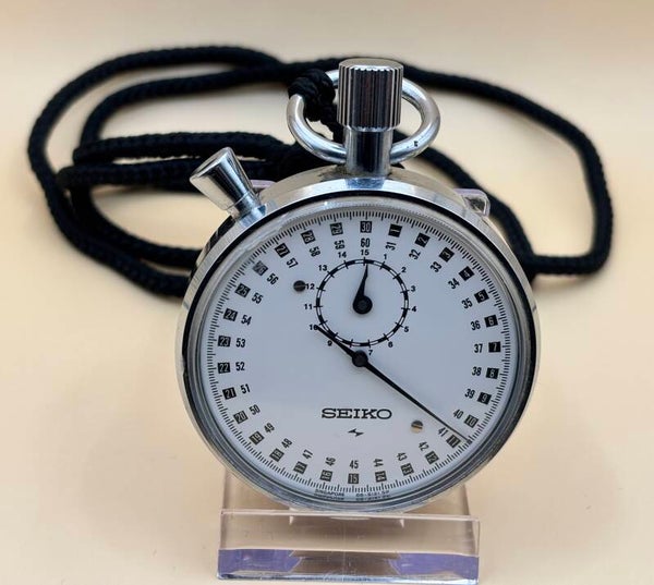 Sportieve, grote en zware Seiko stopwatch met centrale secondewijzer en minutenteller. Handopwinder met betrouwbaar 8800D-werk (7 jewels), geproduceerd door Seiko (brug gemerkt “SINGAPORE”). Start/stop via de kroon; reset via de zijknop. De buitenring is fijn gegradueerd voor nauwkeurige aflezing, de binnenring telt de minuten (tot 30). Met robuuste, verchroomde metalen kast, helder schoon plexiglas en een duidelijke, contrastrijke wijzerplaat met zwarte indexen. Inclusief zwart draagkoord.