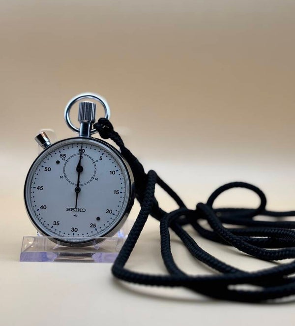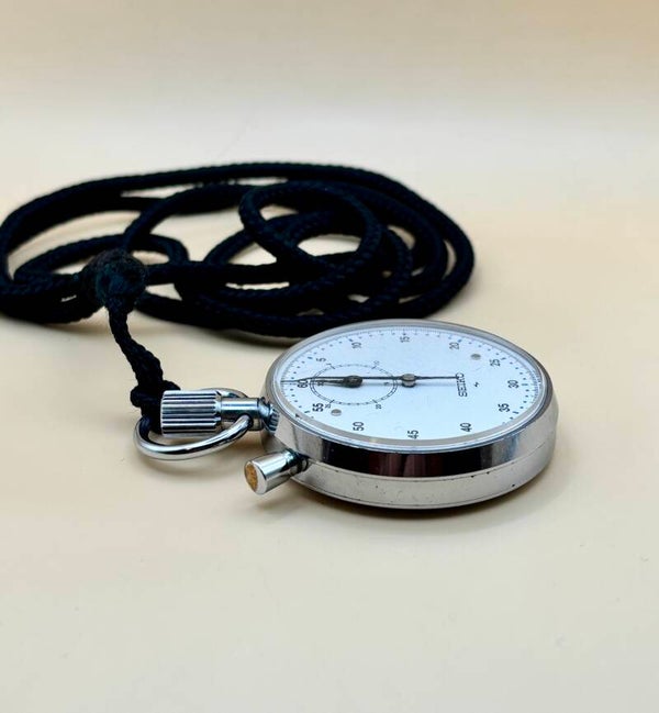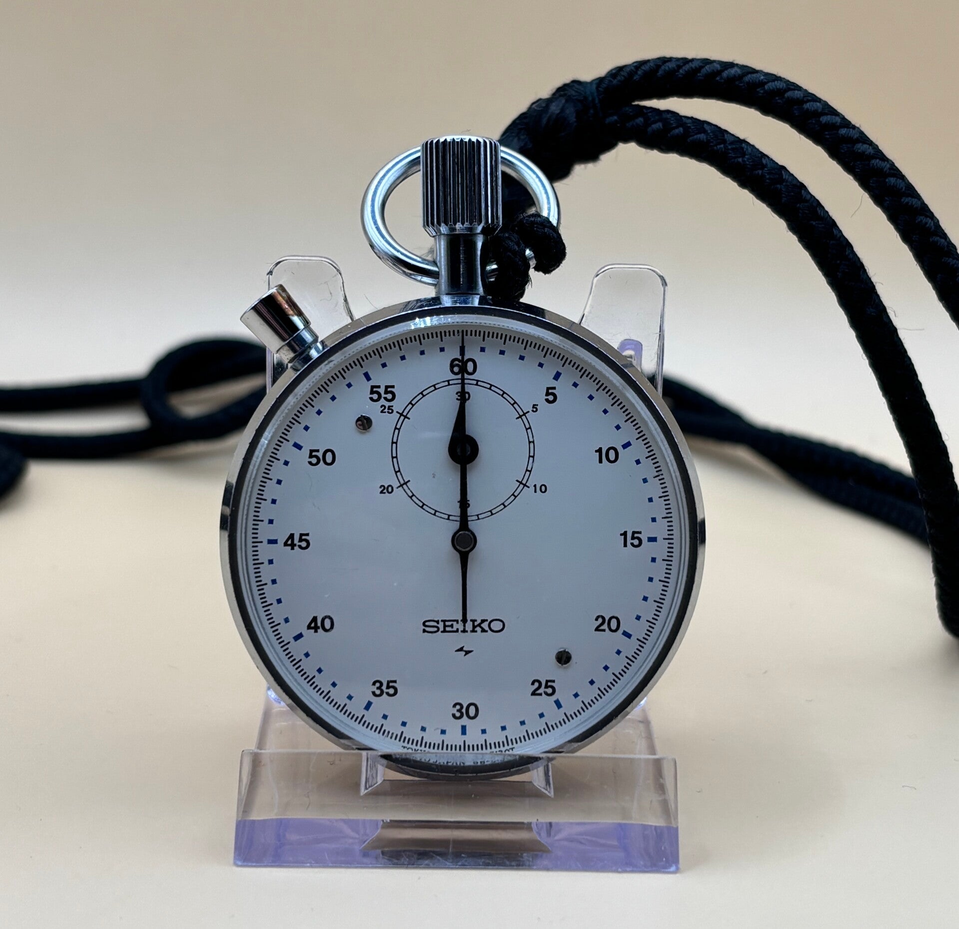 Compacte, professionele Seiko stopwatch uit de Daini-fabriek, met het bekende bliksemschicht-logo op de wijzerplaat. De helder witte plaat met zwarte indexen is uitstekend afleesbaar: de lange centrale wijzer registreert de seconden (met fijne onderverdeling voor tienden van 60 seconden) en de totalisator telt de verstreken minuten tot 30. Glas is helder en schoon, volledig krasvrij. Met draagtouw.