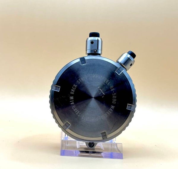 Dit is een robuuste Seiko mechanische stopwatch, referentie 88-5090, in originele doos met koord. De kast is volledig van roestvrij staal, waterdicht (water resistant) en heeft een diameter van ca. 61 mm; het geheel weegt ongeveer 149 gram en voelt daardoor lekker solide aan in de hand.