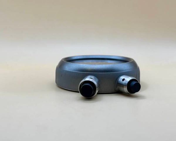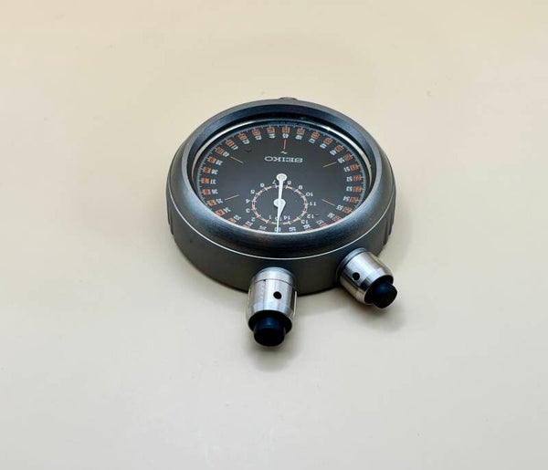 De zwarte wijzerplaat heeft een scherp afleesbare schaal met witte seconden en 1/5-seconde-indexen, waarbij de oranje blokjes de seconden duidelijk markeren. In het midden zit een extra teller voor de verstreken minuten, zodat langere metingen eenvoudig kunnen worden gevolgd. De grote, rubberen en stevige drukknoppen bovenop bedienen start/stop en reset, en onderaan de kast zit een bevestigingsoog voor montage of ophangen.