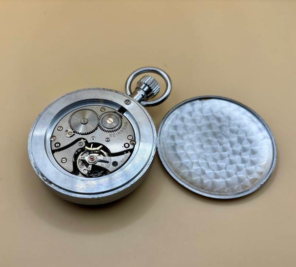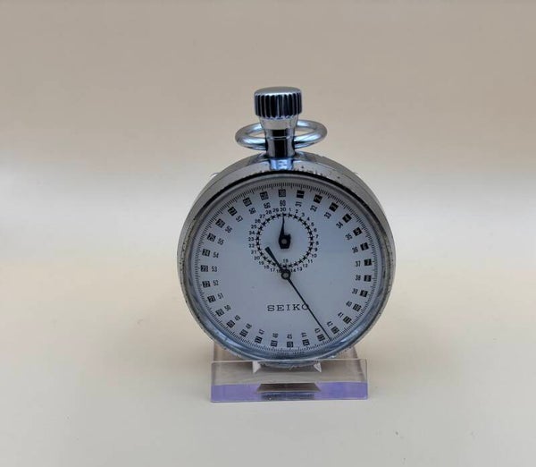 De stopwatch is uitgevoerd in een zware, verchroomde metalen kast die stevig in de hand ligt, hmet wat sporen van gebruik. Binnenin tikt een mechanisch Seikosha-uurwerk gemerkt 9111, herkenbaar aan de gestempelde Seikosha-signatuur en het klassieke ST-logo in de achterdeksel (JAPAN A), een kenmerk van de hoogwaardige meetinstrumenten die Seiko in de jaren zestig en zeventig voor sport en industrie produceerde. Gedateerd op november 1964, Wat dit precisie instrument ruim 60 jaar oud maakt. Loopt nauwkeurig.