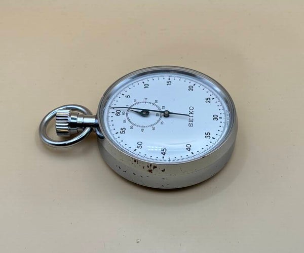 Het uurwerk heeft grote tandwielen, een balans met fijnregulering en de strakke bruggen tonen de degelijke Japanse afwerking uit de mechanische hoogtijdagen van Seiko. Bovenop bevindt zich de kroon voor starten, stoppen en resetten, en een ring voor koord of ketting. Lichte beschadigingen op de achterklep door ouderdom en veelvuldig gebruik, glas helder. De stopwatch loopt soepel en is nauwkeurig.