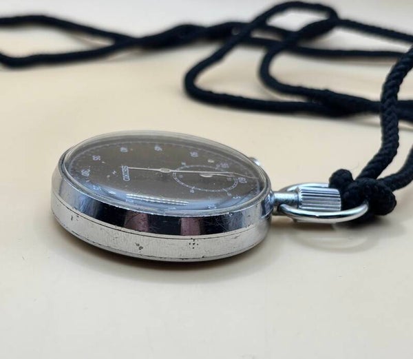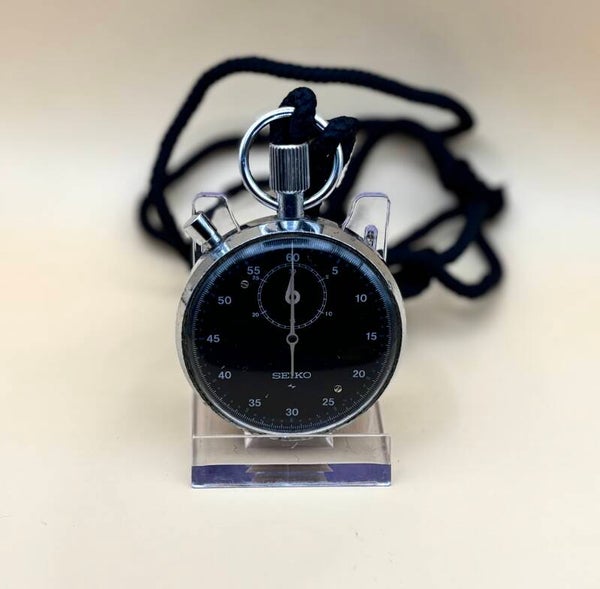Vintage Seiko-stopwatch met zeldzame zwarte wijzerplaat, referentie ACRP 88-5020. De stopwatch wordt geleverd in de originele doos met blauw fluwelen inlay en het zwarte draagtouw. De zwarte wijzerplaat heeft een duidelijke 60-seconden schaal met goed afleesbare witte indexen en een 30 minuten register.