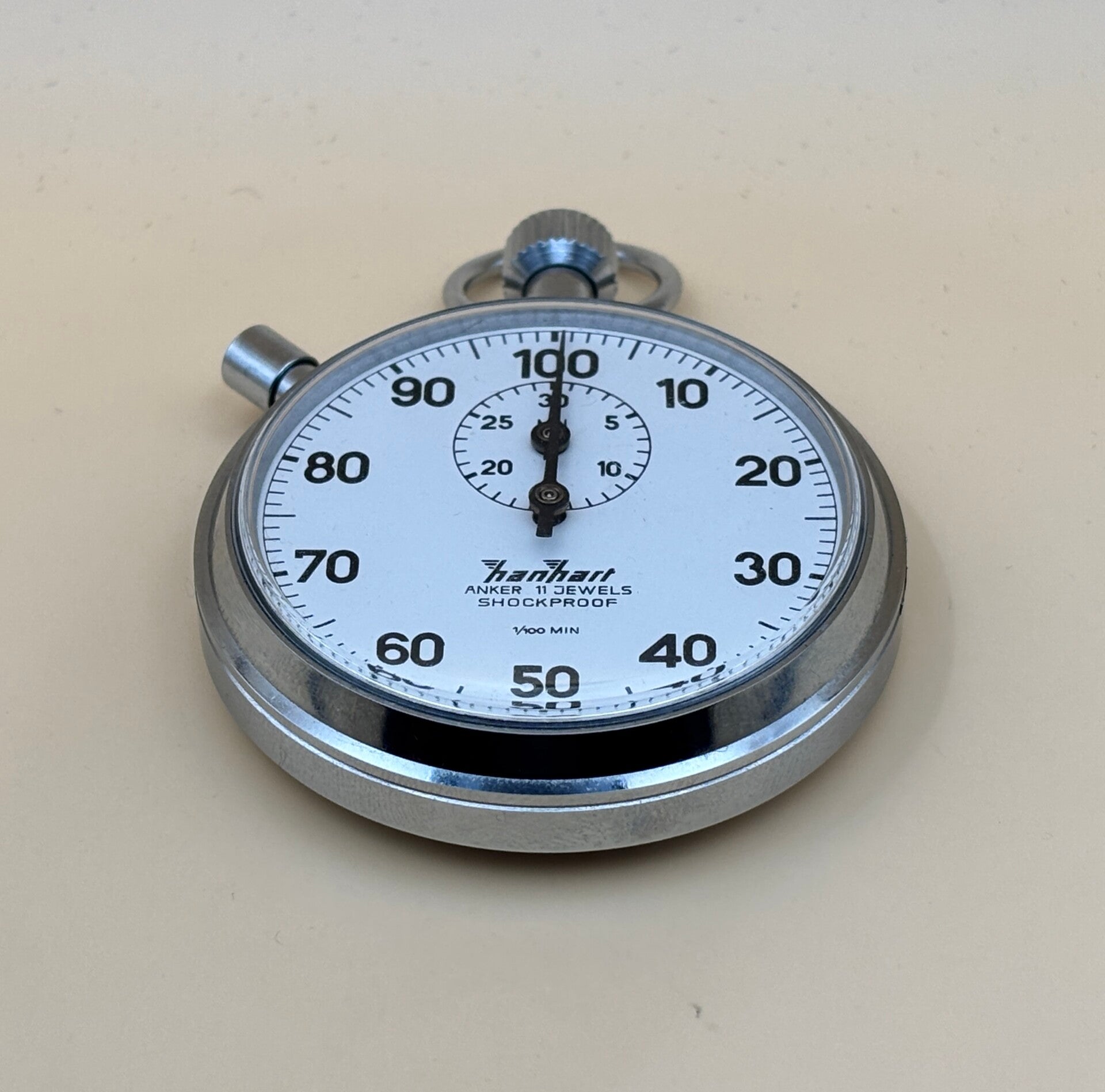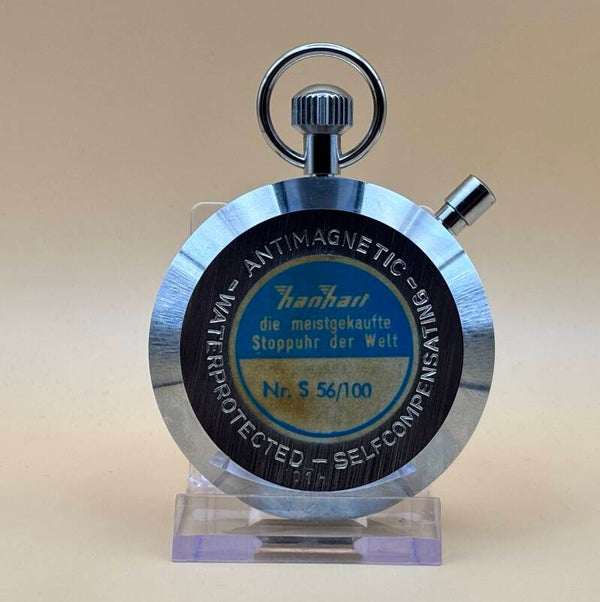 Professionele Hanhart 1/100 MIN stopwatch uit ca. 1965–1975, uitgevoerd met het zeldzamere 11-jewels anker-uurwerk. Dit model behoort tot de beroemde Hanhart-lijn die in de jaren zestig en zeventig bekendstond als “die meistgekaufte Stoppuhr der Welt” – een slogan die nog op de originele achterzijde sticker terug te vinden is.