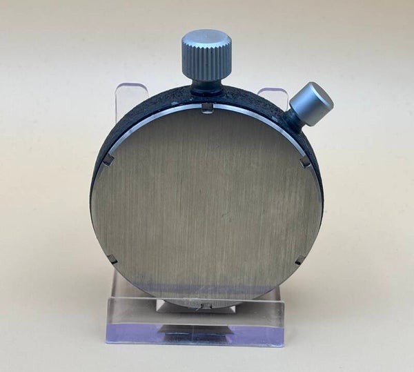 De centrale wijzer maakt één omwenteling per minuut en loopt over een duidelijk afleesbare schaal van 0–100. In de bovengeplaatste subdial bevindt zich een 30-minuten totalisator. Een klassiek Omega rmechanisme: start en stop – reset via de kroon. In zeer goede conditie, de scharnieren van de doos zijn los; houder in goede staat en draagtouw nieuw en met handleiding.