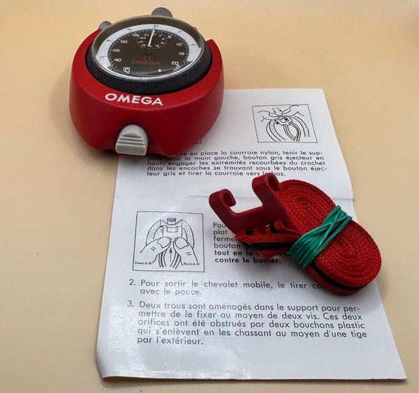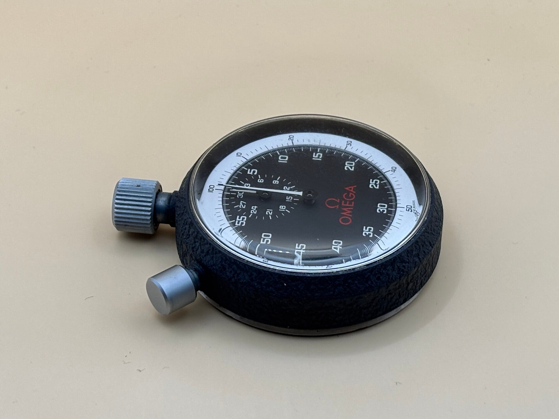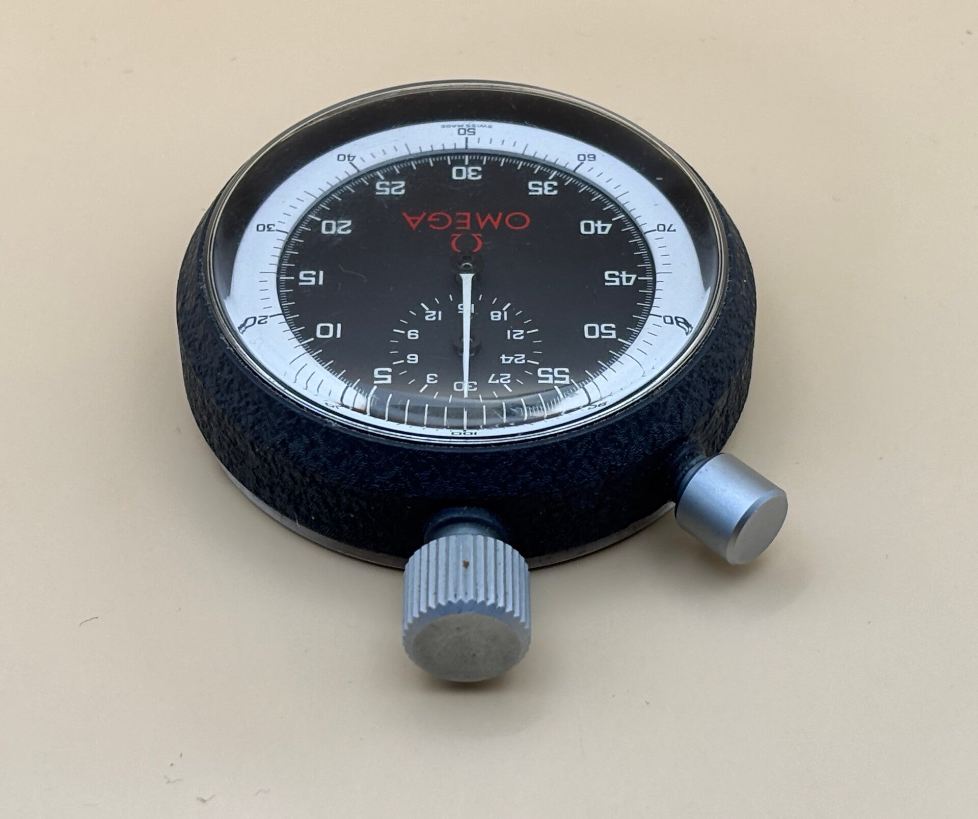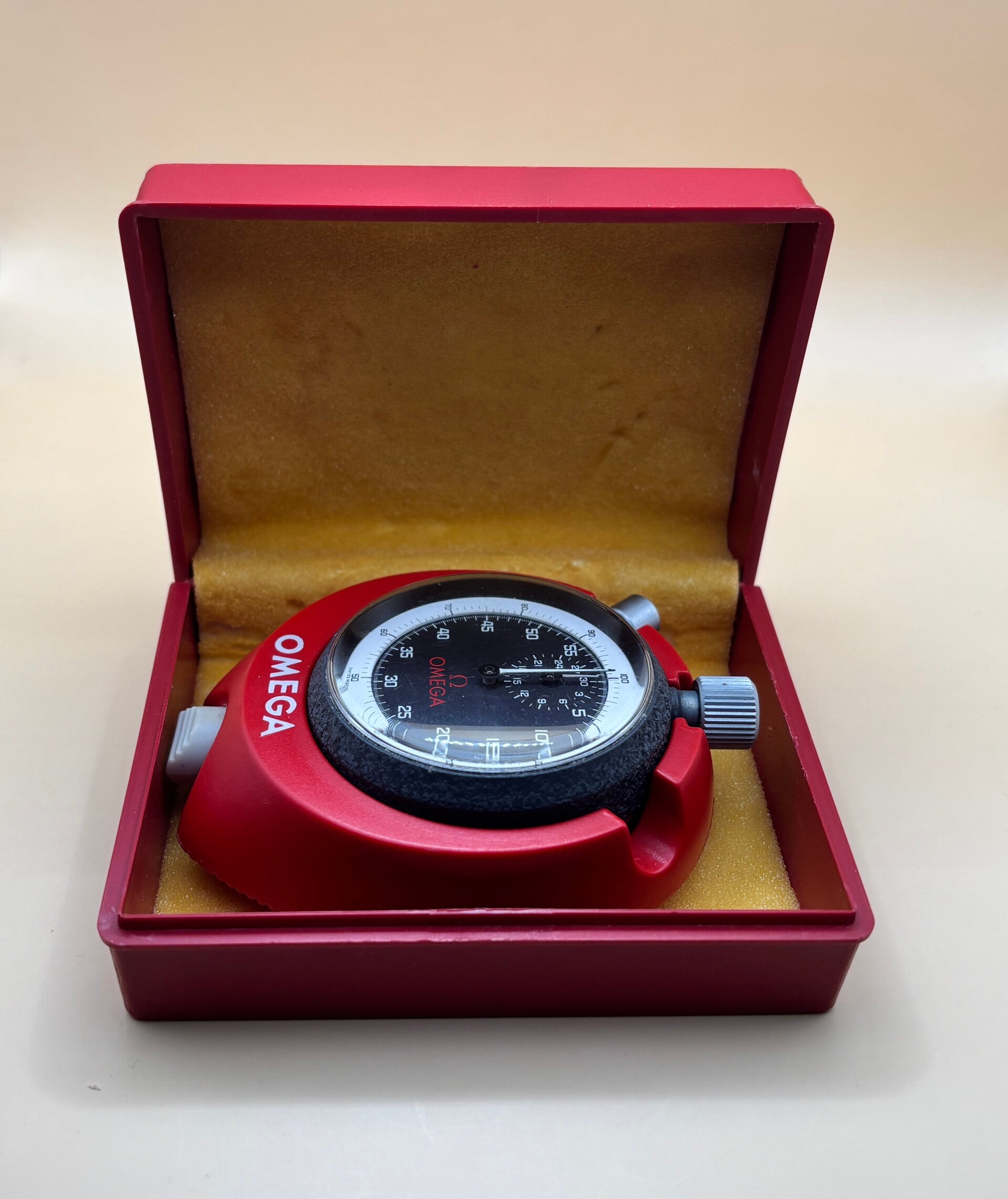 Deze authentieke Omega MG 6310 is een professionele decimale stopwatch waarmee tijd wordt gemeten in 1/100 minuut in plaats van seconden. Met originele doos, rode houder, draagkoord en handleiding. Diameter 54 mm – Gewicht 114 gram, loopt nauwkeurig.