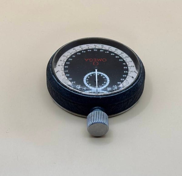 Deze Omega MG 6306 is een klassieke professionele stopwatch uit de late jaren '60 tot vroege jaren '70. Het model is ontworpen voor industriële en technische nauwkeurigheid en meet tijd tot op 1/10 seconde. De centrale wijzer maakt een rotatie in 30 seconden, afgebeeld op een fijn gedetailleerde decimale schaal.