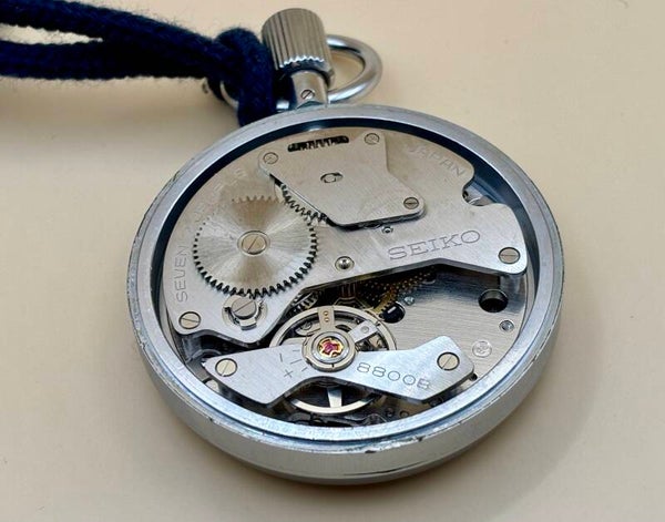 In de kast tikt het robuuste handopwind-uurwerk Seiko 8800A met 7 jewels, zichtbaar door de achterzijde wanneer de dekplaat verwijderd is.