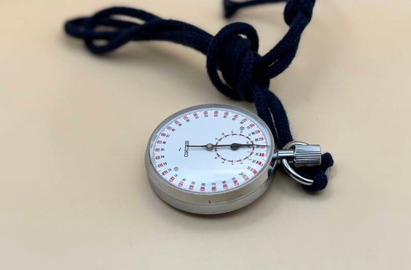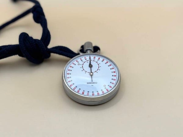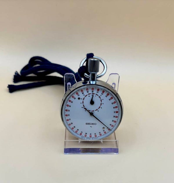 Compacte, professionele Seiko stopwatch uit de Daini-fabriek, met het bekende bliksemschicht-logo op de wijzerplaat. De helder witte plaat met zwarte indexen is uitstekend afleesbaar: de lange centrale wijzer registreert de seconden (met fijne onderverdeling voor tienden van seconden) en de bovenste centrale wijzer telt de verstreken minuten tot 30. Glas is helder en schoon, volledig krasvrij.