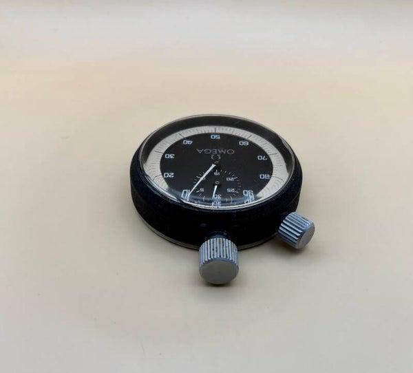 Deze vintage Omega-stopwatch behoort tot de speciale uitvoeringen uit de jaren ’60–’70, bedoeld voor professionele timing onder zware omstandigheden. In plaats van een klassieke drukknop gebruikt deze stopwatch een roterende bedieningsknop om het uurwerk te starten, stoppen en te resetten. Dit maakt het model bijzonder veilig voor industriële toepassingen, laboratoria en sporten waarbij per ongeluk indrukken van een knop moest worden voorkomen.