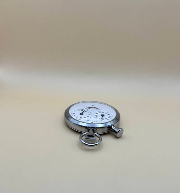 Iconische Junghans Dreikreis-stopwatch in zakhorlogeformaat, met het karakteristieke drieregister-wijzerplaatontwerp en een nauwkeurige 1/10-secondeweergave. Een fraai stukje Duitse meet- en horlogegeschiedenis uit de tweede helft van de twintigste eeuw.