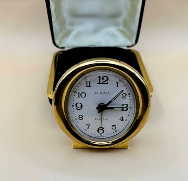Deze kleine Europa-reiswekker in luxe klapdoos oogt alsof hij zo uit een hotelkamer uit de jaren zeventig is weggelopen. Het goudkleurige kastje vangt het licht, terwijl de witte wijzerplaat met grote, duidelijke cijfers rustig de tijd aangeeft. Geen poespas, gewoon een betrouwbare metgezel op het nachtkastje of in de koffer, gemaakt om je na een lange reis precies op tijd weer wakker te tikken. Met originele doos.