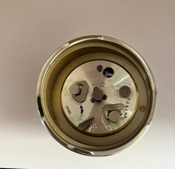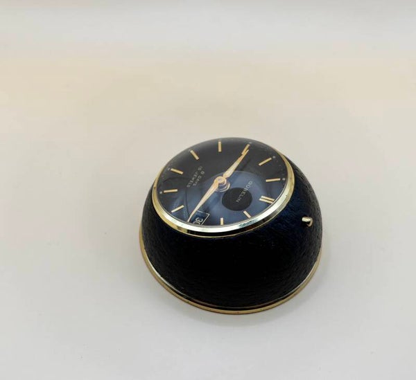 De ronde klok zit in een luxe zwart bekleed etui met zachte, lichtgekleurde binnenkant: dichtgevouwen veilig voor in koffer of tas, opengeklapt een stijlvol bureautje of nachtkastklokje. Een chique, typisch jaren ’60/’70 reiswekker voor de verzamelaar of liefhebber van klassieke Zwitserse horlogerie.
