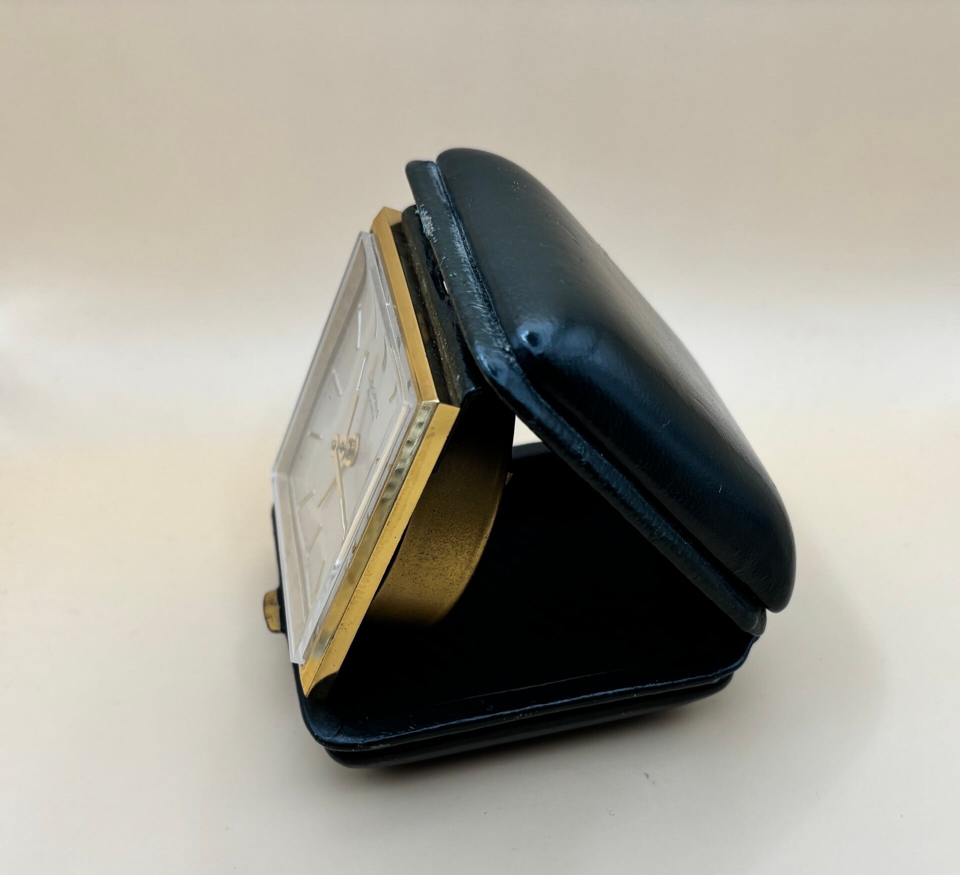 De klok klapt uit de etui omhoog en staat dan stabiel op het nachtkastje; ingeklapt is hij plat en ideaal om mee te nemen op reis. Aan de achterzijde zitten aparte knoppen voor het opwinden en instellen van tijd en alarm, plus een regelaar voor de alarmsterkte. De etui en metalen delen vertonen wat lichte slijtage aan de randen, maar alles is netjes en het uurwerk loopt goed. Een elegante, praktische reisgenoot voor de liefhebber van mechanische wekkers.