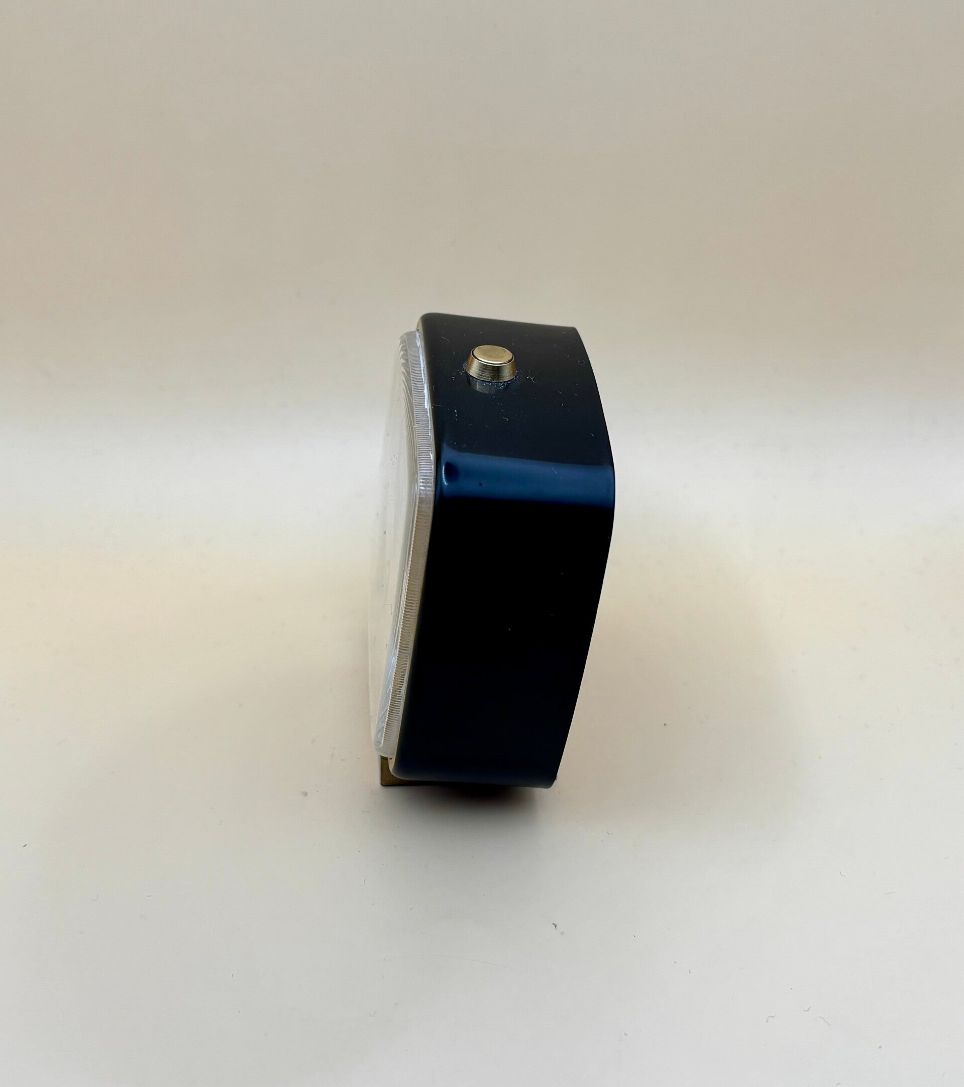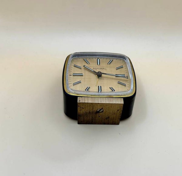 Strakke vintage reiswekker van Amyral, een Zwitsers model dat door Looping werd gefabriceerd. De wekker heeft een compact, vierkant kastje met afgeronde hoeken in donkerblauwe/zwart gelakte afwerking en een goudkleurige rand. De champagnekleurige wijzerplaat is sober en modern, met opgelegde staafindexen en slanke wijzers; bovenop zit de drukknop voor het alarm. Aan de achterzijde bevinden zich de opwind- en stelknoppen voor tijd en alarm. Mooi bewaard exemplaar met lichte gebruiks- en ouderdomssporen, precies wat je bij een originele reiswekker uit deze periode, jaren 60, verwacht.