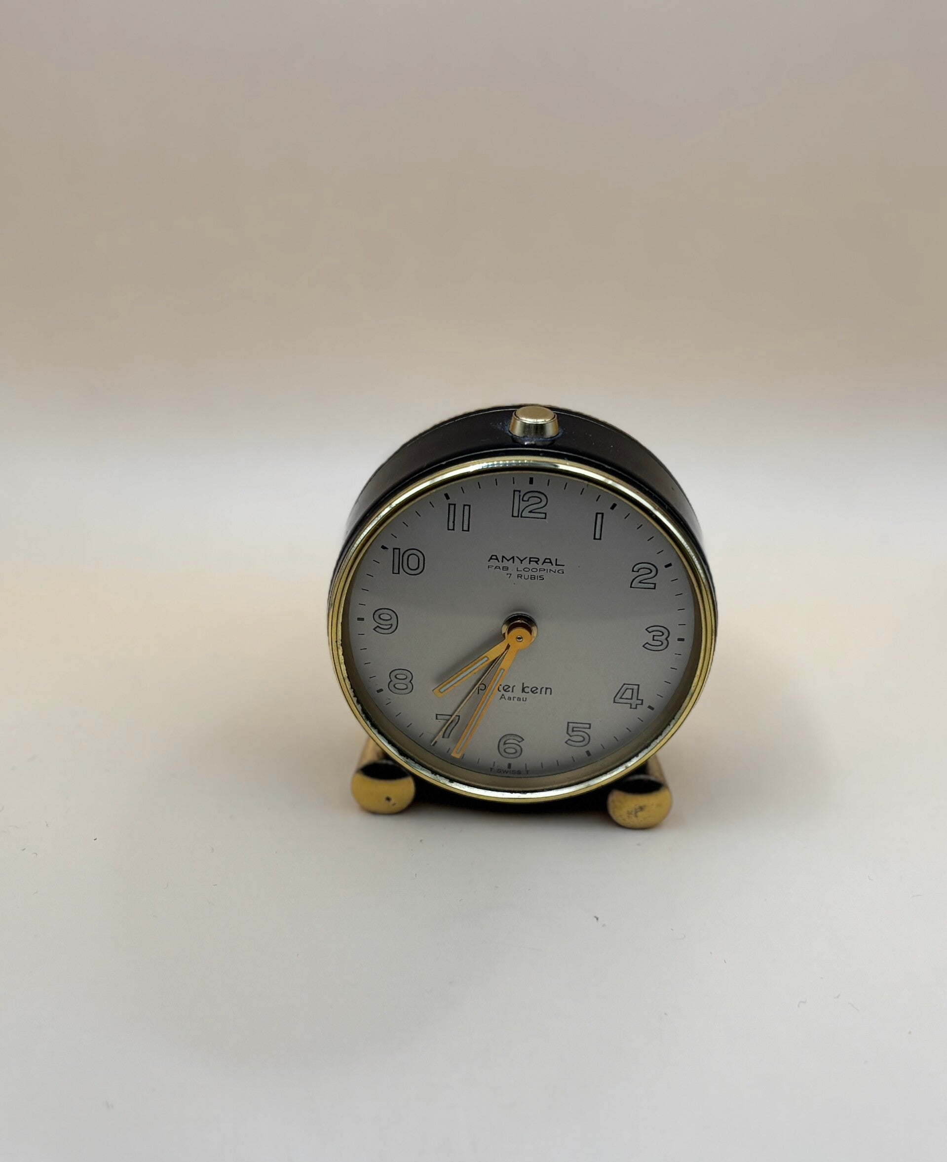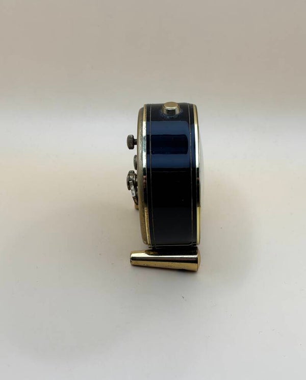 Charmante Zwitserse reiswekker van Amyral, voorzien van een mechanisch uurwerk met 7 stenen (7 rubis) en op de wijzerplaat netjes gemerkt “AMYRAL – Fab. Looping”. Het model heeft een compacte ronde kast in donkerblauw/zwart met goudkleurige bezel en twee kleine frontpootjes, typisch voor de jaren 60/70. De matte zilverkleurige wijzerplaat is strak en goed leesbaar met Arabische cijfers, fijne minutenindex en opvallende goudgele wijzers; onderin staat de retailersignatuur “per kern, Aarau”. Bovenop zit de alarmdrukknop en aan de achterzijde de opwind- en stelknoppen voor tijd en alarm. Mooi vintage exemplaar met lichte gebruikssporen passend bij de leeftijd.