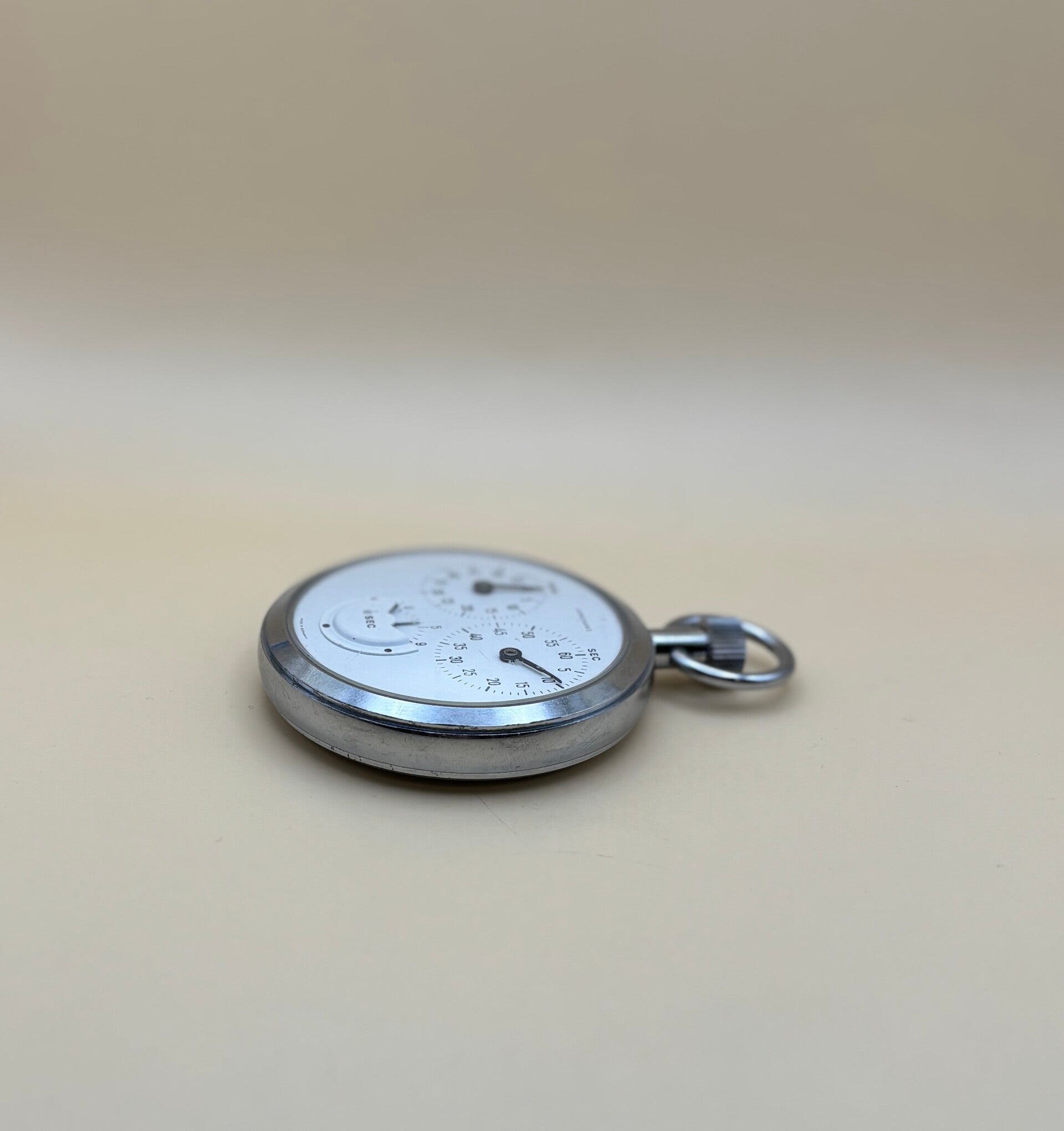 Technische details: precisie-ankeruurwerk met paletgang, 7 juwelen. Schokbestendig, Antimagnetisch en met onbreekbare Nivarox-spiraalveer. Verchroomde metalen kast van 55 mm, spatwaterdicht. Meetbereik van 0,1 seconde tot 60 minuten.