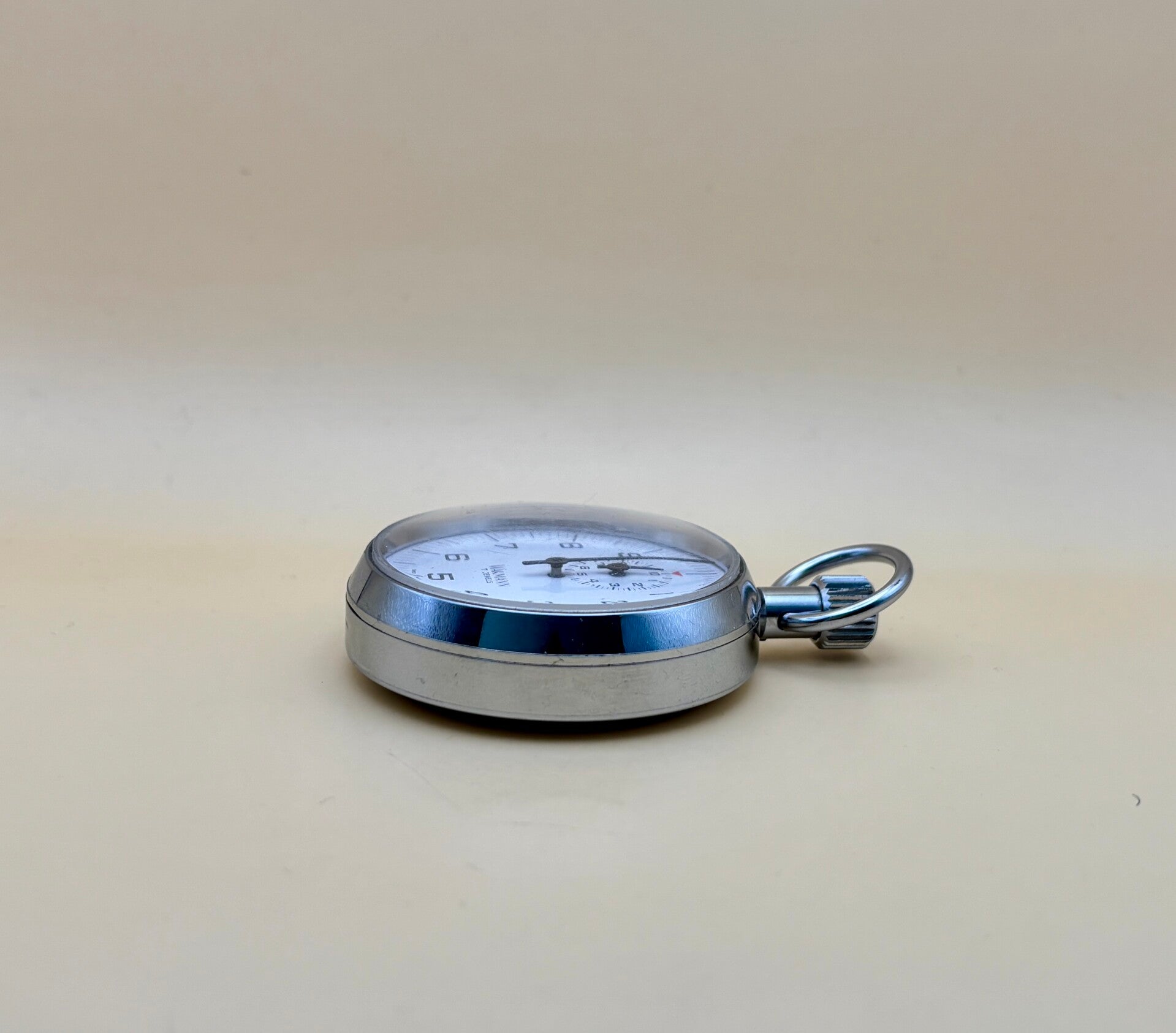 Strakke en goed leesbare Wakmann stopwatch uit Zwitserse productie, uitgevoerd met een witte 10 seconden wijzerplaat en een 10 minuten totalisator. De stopwatch heeft een diameter van 50 mm en een gewicht van 102 gram.