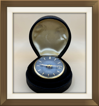 Elegante opklapbare reiswekker van Gübelin met diepblauwe wijzerplaat, goudkleurige indexen en datumvenster op 3 uur. De klok is uitgerust met een hoogwaardig Zwitsers 8-daags mechanisch uurwerk met 15 jewels, waardoor hij na één keer opwinden dagenlang betrouwbaar doorloopt.