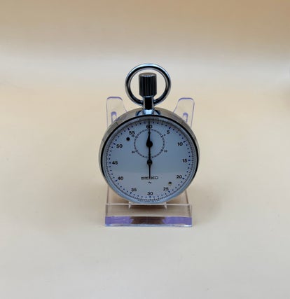 Compacte, professionele Seiko stopwatch uit de Daini-fabriek, met het bekende bliksemschicht-logo op de wijzerplaat. De helder witte plaat met zwarte indexen is uitstekend afleesbaar: de lange centrale wijzer registreert de seconden (met fijne onderverdeling voor tienden van seconden) en de bovenste centrale wijzer telt de verstreken minuten tot 30. Glas is helder en schoon, volledig krasvrij.