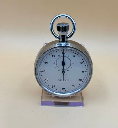 Compacte vintage Seiko-stopwatch uit Tokyo, Japan, met een doorsnede van 47 mm en een gewicht van 69 gram. De witte wijzerplaat heeft een duidelijke 60-seconden schaal met fijne indexen en een centrale secondewijzer, plus een 30-minuten totalisator in een kleinere binnenring – ideaal voor sport- of industriële metingen.