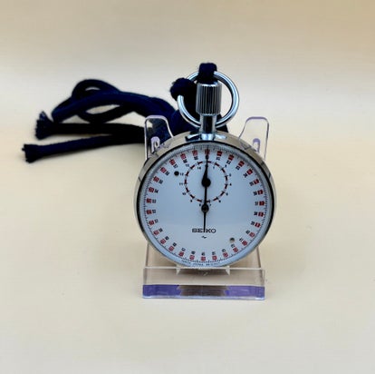 Compacte, professionele Seiko stopwatch uit de Daini-fabriek, met het bekende bliksemschicht-logo op de wijzerplaat. De helder witte plaat met zwarte indexen is uitstekend afleesbaar: de lange centrale wijzer registreert de seconden (met fijne onderverdeling voor tienden van 60 seconden) en de totalisator telt de verstreken minuten tot 30. Glas is helder en schoon, volledig krasvrij. Met draagtouw.